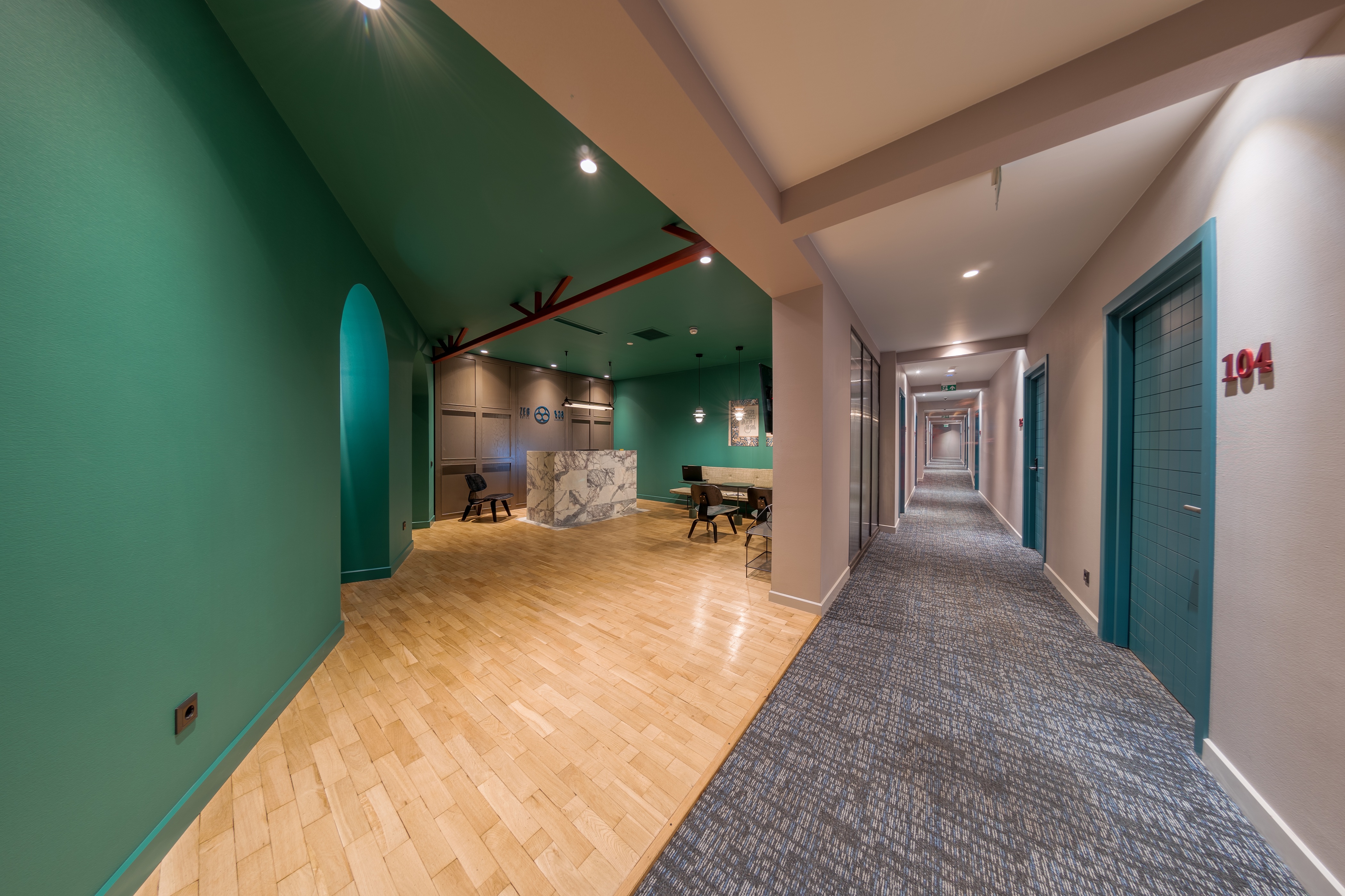 Guestrooms lighting concept is decided with spotlight for general lighting, while lighting fixtures for reading functions are decorative flute like pendants, guestroom bathrooms are equipped with wet area compatible downlights. Guestroom corridors are lit with downlights for general lighting and tiny downlights for accent of room numbers. General areas are fit with branded decorative lighting fixtures for functional and ambiance lighting reasons, create atmosphere and ensure welcoming environment, while accentuating interior’s modern elegance.