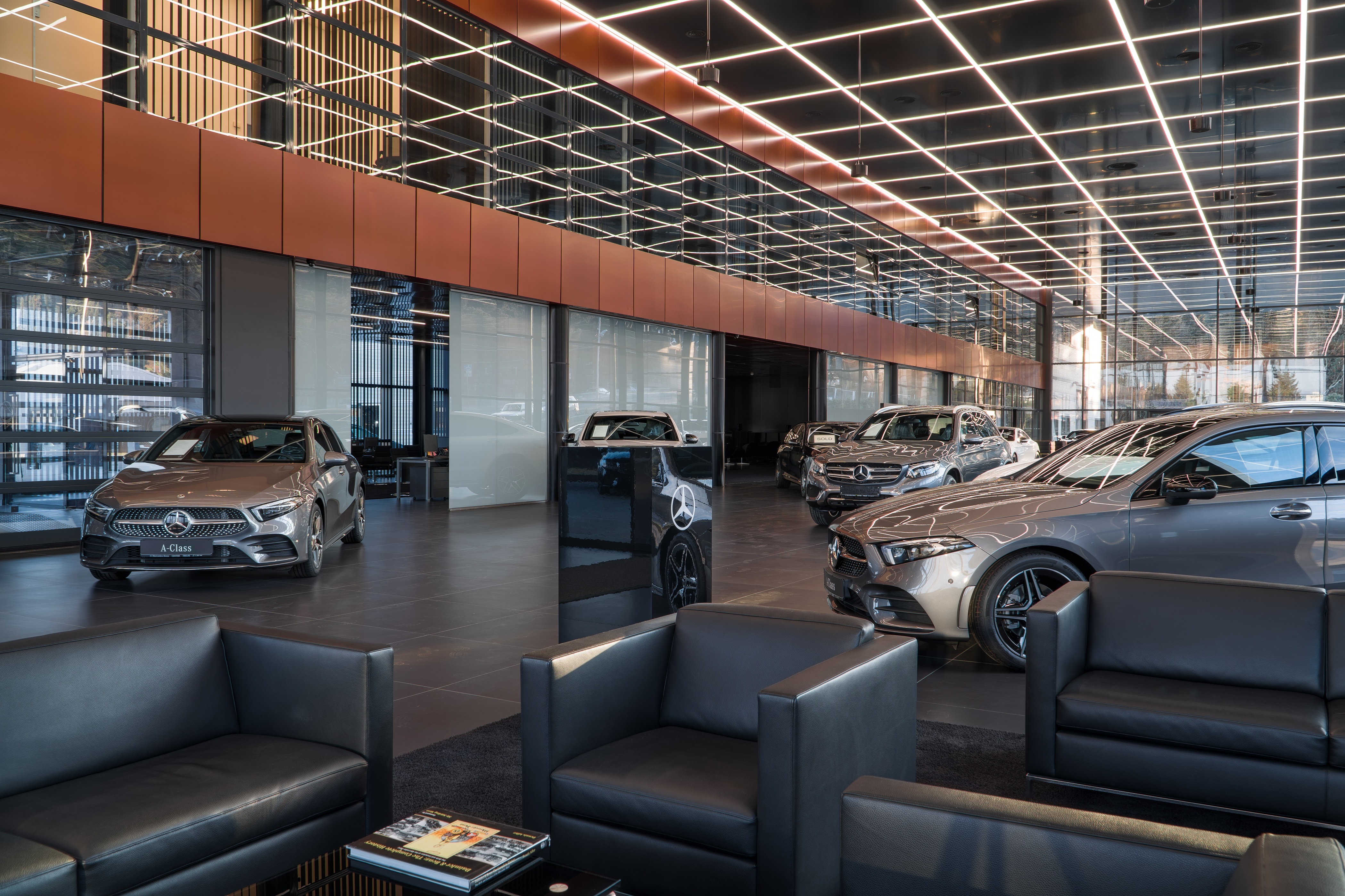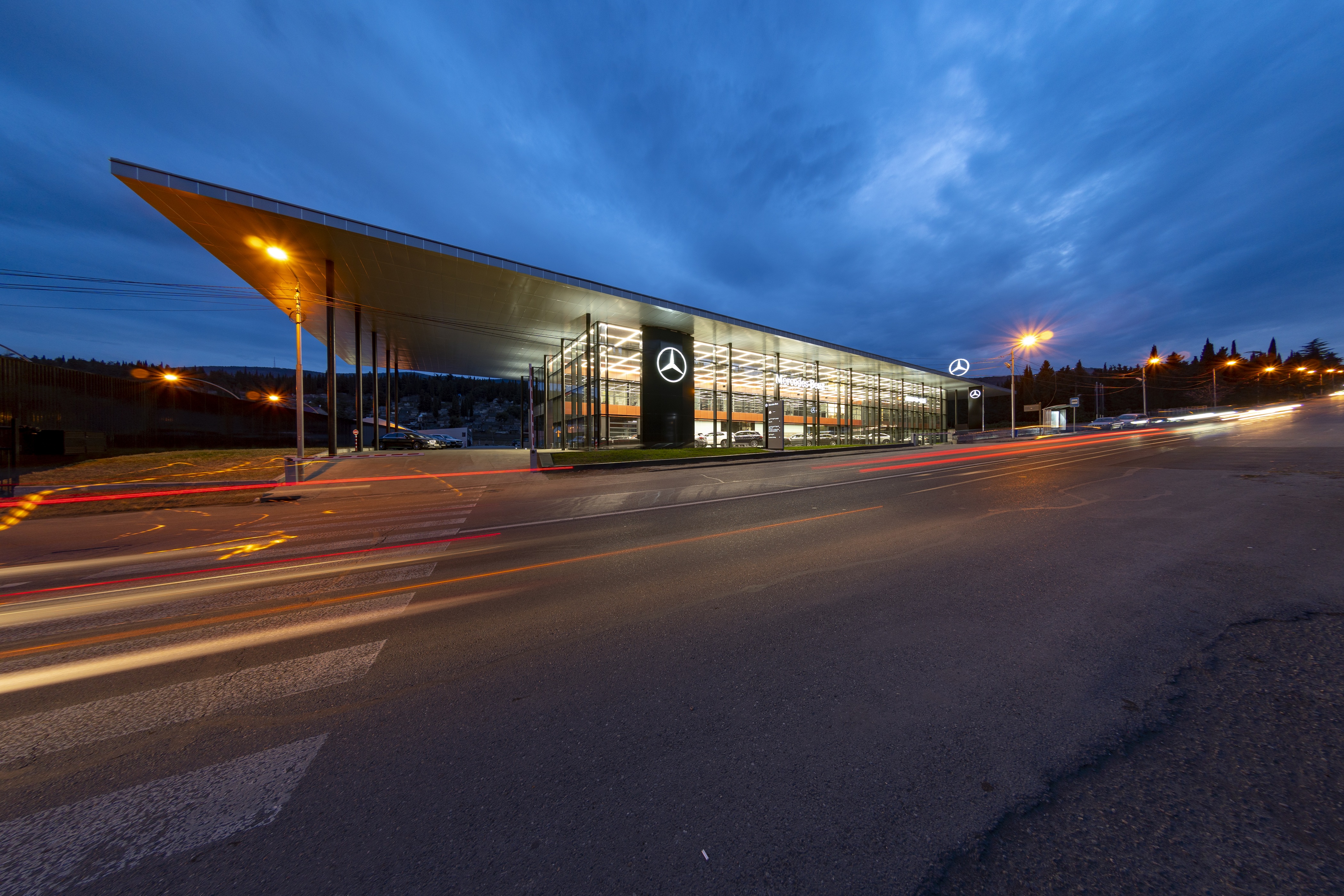 Mercedes-Benz Georgia is a contemporary automotive center that brings together a showroom, office spaces, and a service center within a single architectural complex. The project is distinguished by its large-scale glass façade, which defines the building’s modern and transparent character.