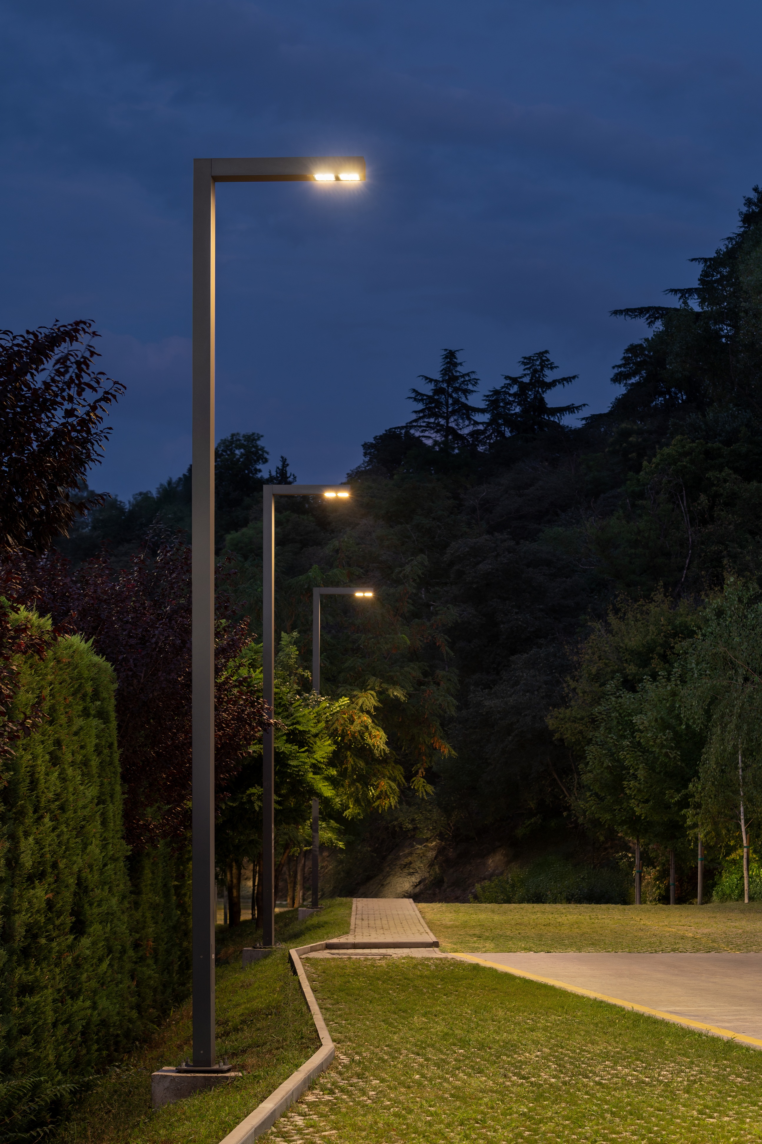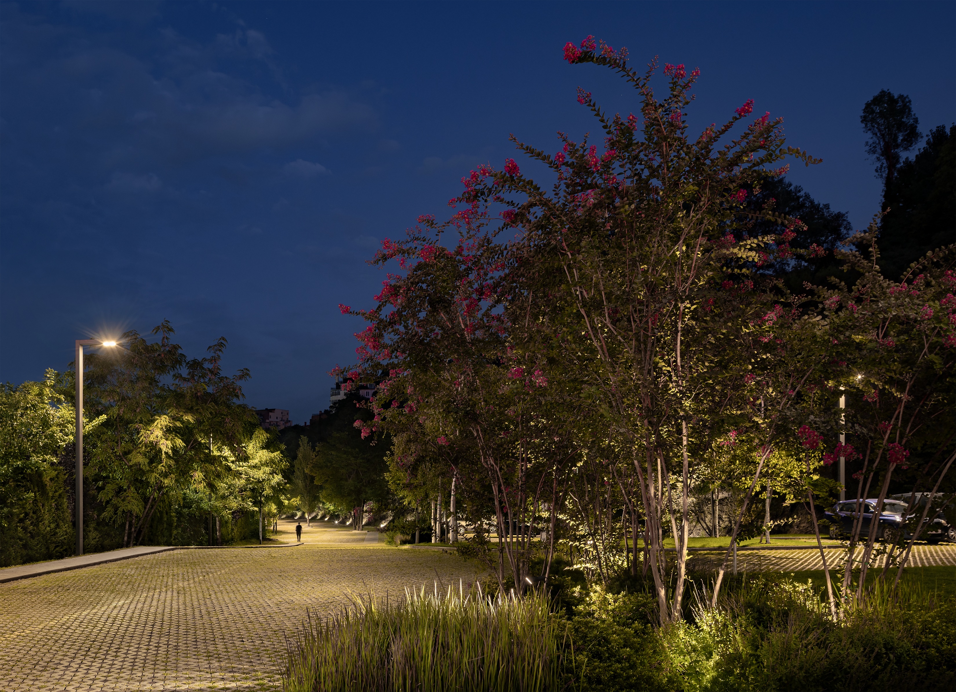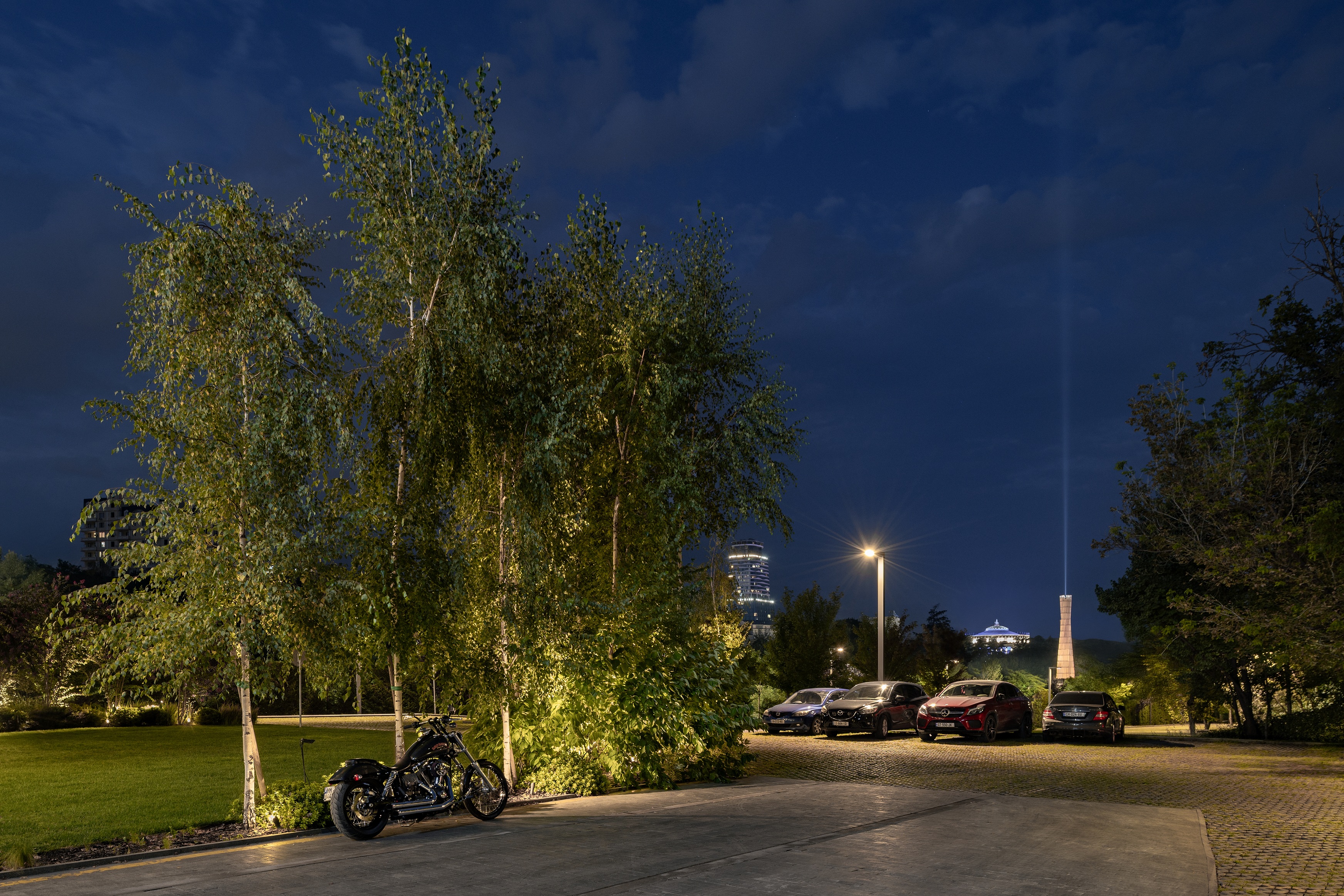 LightStudio performed lighting calculations and luminaries selection for all adjacent roads, pathways, parking lot, landscape areas. The package also included supply of lighting fixtures according to project–street lighting, in-ground uplights, projectors for greenery compositions. The lighting concept was developed to ensure both functionality and atmosphere - offering safe navigation, accentuating greenery, and enhancing the impression territory after dark hours.